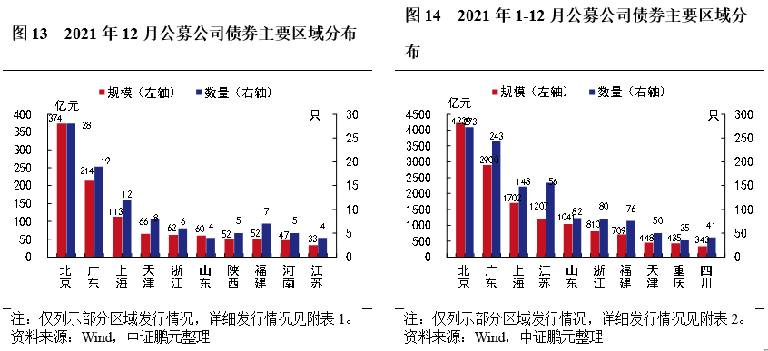區(qū)域分布方面,12月份公募公司債券主要集中于北京、廣東、上海等地,私募公司債券主要集中在江蘇、山東、浙江等地。