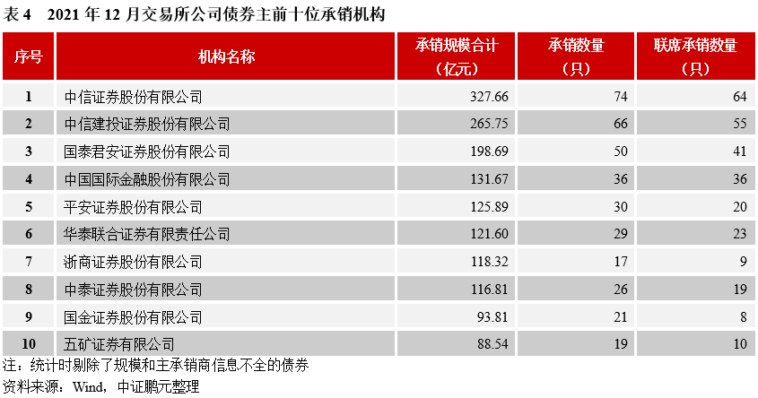 主承銷商方面,12月份共82家機構(gòu)參與交易所公司債券承銷,中信證券、中信建投證券和國泰君安的承銷規(guī)模分別位居前三位。