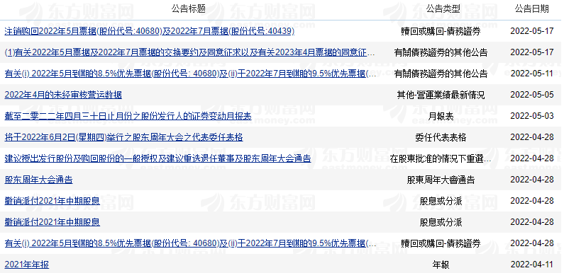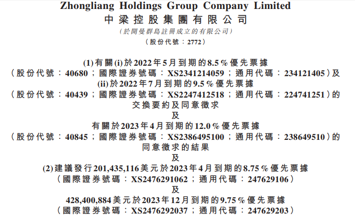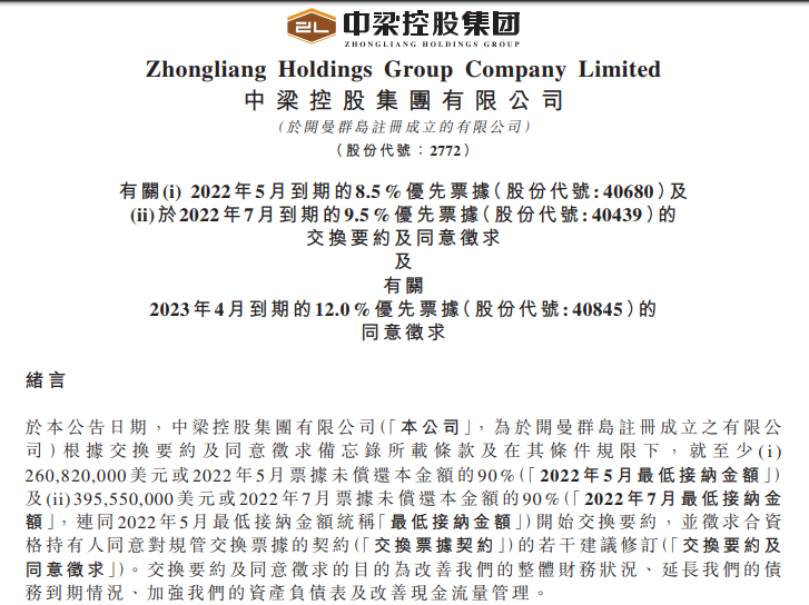 如上文所述,日前中梁控股發布公告,上述兩筆2022年5月到期與2022年7月到期的美元票據(「交換票據」)將會交換為2023年4月,2023年12月到期的新美元票據。