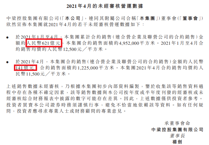 而2021年的前4月,中梁控股合約銷售更是高達621億元,當時前4月單價約12500元/平米。