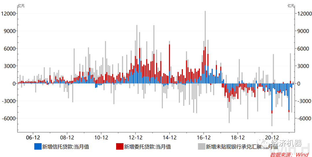5)表外融資顯著活躍。3月表外融資增加133億元,同比多增4262億元,顯著提升。其中,未貼現(xiàn)銀行票據(jù)增加286億元,同比多增2582億元,貢獻(xiàn)最大。信托貸款減少259億元,同比多增1532億元,持續(xù)第4個(gè)月同比多增(圖7)。信托貸款的壓減速度顯著減緩,可能表明,對(duì)信托行業(yè)的打壓已到極限,但短期的反彈不能表明對(duì)信托貸款監(jiān)管的放松,信托貸款大概率仍不是未來(lái)社融增長(zhǎng)的主要方向。