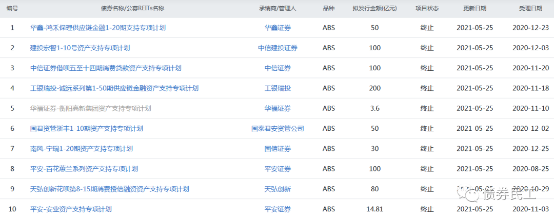 從本次終止的ABS的產(chǎn)品類型來看,包括供應(yīng)鏈金融資產(chǎn)證券化產(chǎn)品、保理資產(chǎn)證券化產(chǎn)品、PPP項(xiàng)目資產(chǎn)證券化產(chǎn)品、疫情防控ABS等各種類型的資產(chǎn)證券化產(chǎn)品。