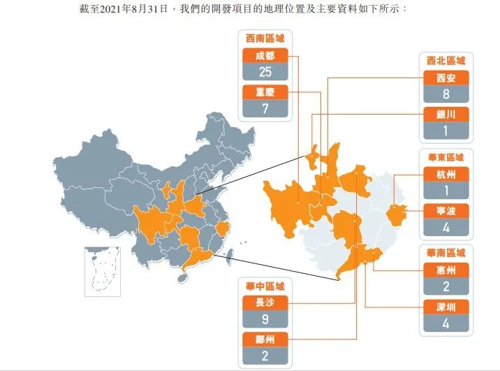 如招股書所言,合能控股把物業開發及銷售業務的戰略地域重心,放在經濟基礎雄厚的城市——經濟增長潛力巨大的中國西南區域、中國西北區域、華中區域、華南區域及華東區域的十座城市。