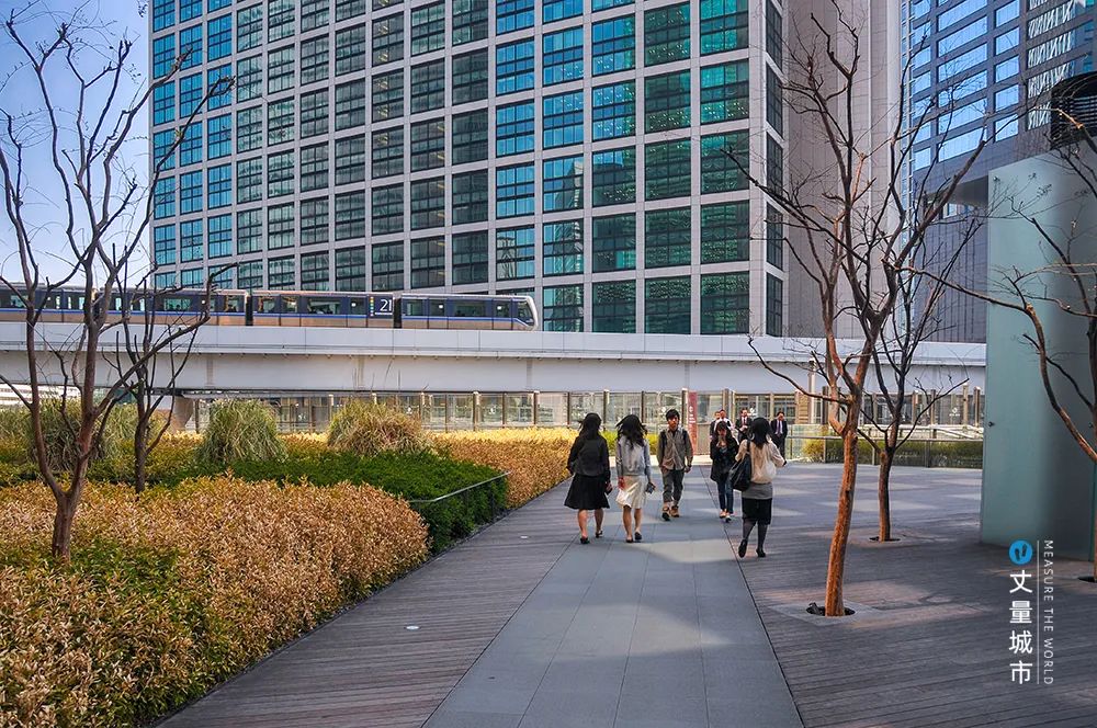 基于公共空間管理要求,聯(lián)合協(xié)會拿出了立體步行道路體系的解決方案:汐留地區(qū)寫字樓、商業(yè)、住宅、車站等多種功能高度復(fù)合,通過分層的立體交通建設(shè),實(shí)現(xiàn)步行、車行、軌道交通的分別治理。