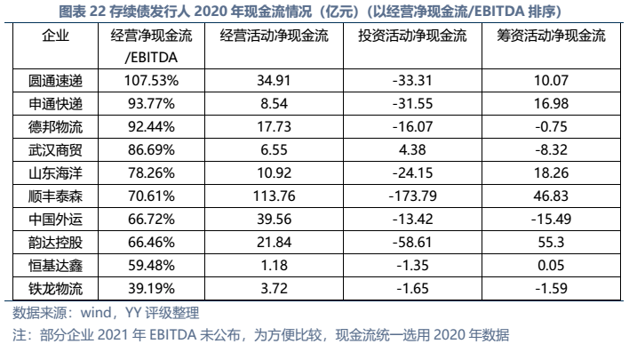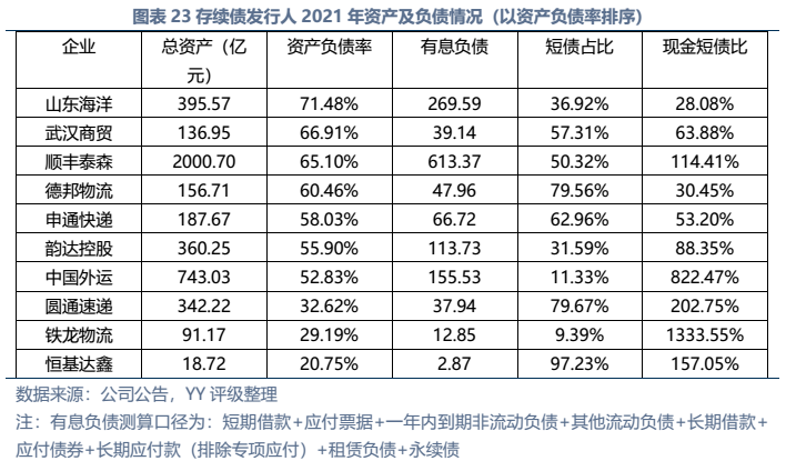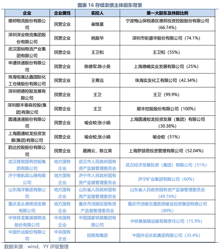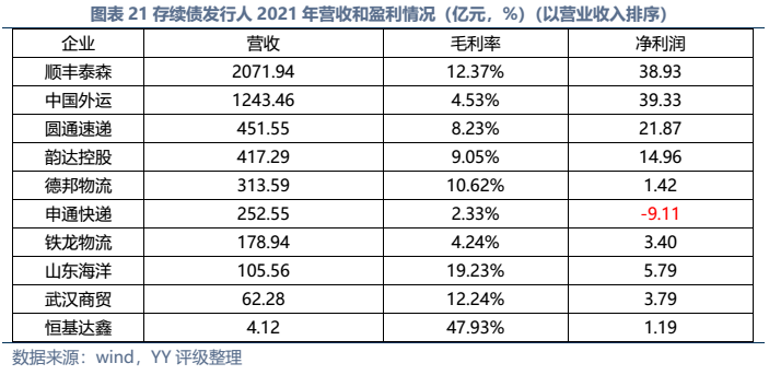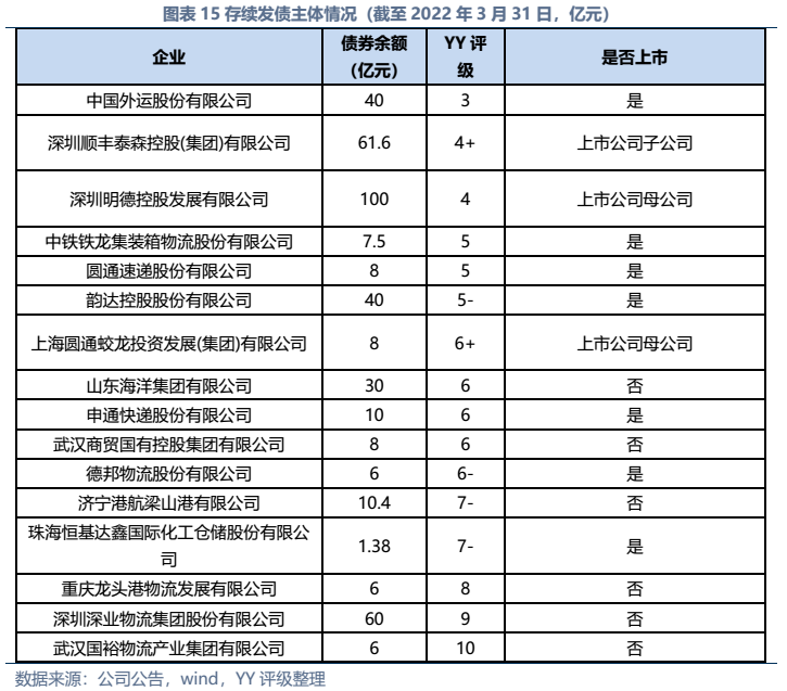 信用債市場方面,上市公司中高頻出現的“多式聯運”、“智慧物流”、“供應鏈管理”等概念在發債主體中熱度不高,主要仍以傳統物流企業為主。截至22年3月末,YY行業為物流的存續債主體共有16家,債券余額合計為402.88億元。行業整體毛利率不高(平均13%),杠桿率偏低(平均資產負債51.3%)。資質方面,貨代龍頭中國外運信用資質最好,中鐵鐵龍集裝箱背靠國鐵集團資源,信用資質也較好??爝f細分領域集中度較高,市場格局相對穩定,也有較強的經營獲現能力支撐,順豐、韻達、圓通信用資質尚可,申通快遞盈利較差,資質稍弱。濟寧港航梁山港、珠海恒基達鑫、重慶龍頭港等工業品物流企業信用資質較弱。