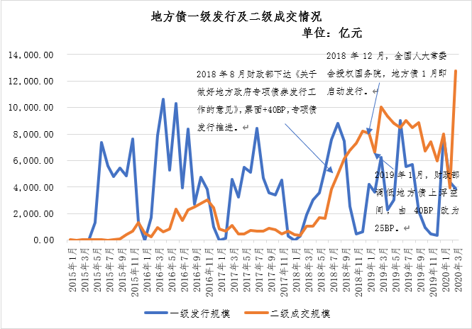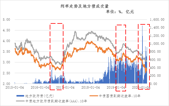 所謂地方債發(fā)行節(jié)奏改革,即根據(jù)2018年8月財政部所頒布《意見》要求,各地區(qū)加快專項債發(fā)行進度,當(dāng)月地方債發(fā)行規(guī)模即創(chuàng)出歷史新高,疊加彼時上浮40BP的票面政策,一二級市場存在較大套利空間,量升價優(yōu),地方債二級市場交易量也創(chuàng)出新高。其后,為提升地方債對基建拉動效用,平衡全年發(fā)行節(jié)奏,2018年末全國人大常委會授權(quán)國務(wù)院可提前下達下一年度部分地方債務(wù)額度。受此影響,自2019年1月開始,地方債一級市場一季度就形成“開門紅”局面,發(fā)行量遠高于四季度,該局面一直延續(xù)至今日。該制度改革的伴生影響則是,一季度地方債交易活躍度也大幅提升,部分時間高于受獲利了解影響交易規(guī)模大增的四季度。