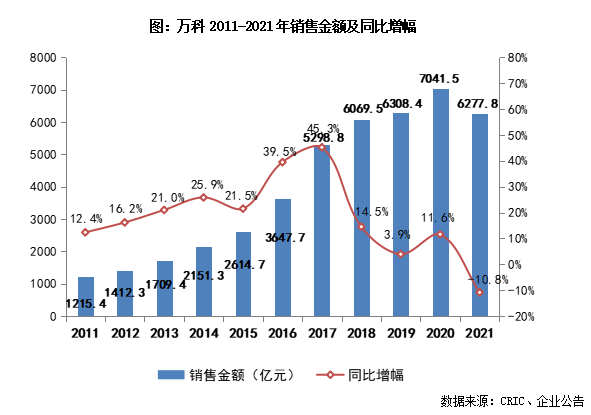 2021年,萬科累計實現合同銷售金額6277.8億元,銷售面積3807.8萬平方米,分別同比降低10.8%和18.4%;銷售均價16487元/平方米,同比增長9.3%。在百強房企整體業績規模同比回落的行業趨勢下,萬科2021年的銷售規模也出現負增長。