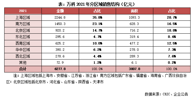 【全國43個城市市場排名位列前三】2021年,萬科累計實現合同銷售金額6277.8億元,銷售面積3807.8萬平方米,分別同比降低10.8%和18.4%,銷售規模負增長。2021年萬科在全國43個城市市場的排名位列前三,其中20個城市排名第一。分區域結構來看,業績貢獻最高的上海區域實現銷售金額2244.8億元,銷售金額占比較去年提升至35.8%。