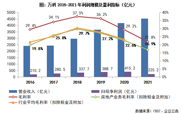 其中,受權益法確認的投資收益及股權轉讓相關收益較2020年減少69億元,對部分項目、個別股權投資計提資產減值35.3億元,均對萬科2021年的利潤規模有負面影響。從盈利指標來看,2021年萬科實現毛利率21.8%,扣除稅金及附加之后的房地產業務毛利率16.9%、凈利率8.4%、歸母凈利率5.0%,各盈利指標均處于歷史較低水平。