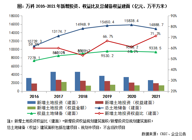 2021年,萬科保持量入為出的投資態度,全年新增土地投資規模略有降低。年內,萬科累計新獲取項目148個,總規劃建筑面積2667.4萬平方米,權益規劃建筑面積1901.4萬平方米;權益地價總額約1401.5億元,新增項目平均地價為6942元/平方米。2021年,萬科新增投資權益占比71.3%,較2020年明顯提升且處于近年來的較高水平。