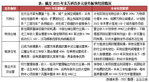 除了在地產開發主業穩健發展,不斷提升產品和的服務競爭力,2021年萬科繼續堅持“城市配套服務商”的戰略定位,在物業服務、物流倉儲、住宅租賃、商業開發運營等多元業務板塊實現有質量發展。雖然對這部分多元業務的探索需要較大的投入,經營收入和利潤規模短期內也無法比及地產開發。但長期來看,經營和服務業務的發展韌性更強,能帶來穩定的現金流,還能為未來公司價值增長提供更多的支撐。