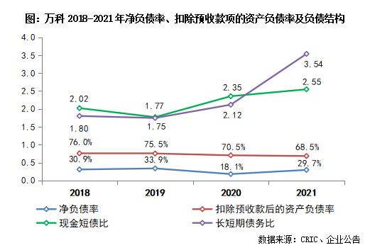 截至2021年末,萬科持有貨幣資金1493.5億元,有息負債總額2659.6億元;現金短債比和長短期債務比分別為2.55和3.54,凈負債率29.7%,負債結構較2020年進一步改善。平均融資成本4.11%,在整體融資環境趨緊的行業背景下,萬科得益于長期穩健經營的財務政策,凈負債率和融資成本穩定在行業較低水平。扣除預收款項的資產負債率優化至68.5%,三道紅線滿足綠檔達標。2021年,萬科繼續保持行業領先的信用評級,穆迪、標普、惠譽分別給出了Baa1、BBB+、BBB+的“投資級”信用評級。