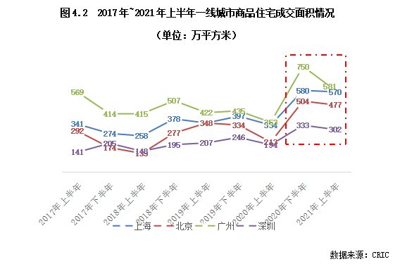 正是由于外來人口的持續流入,一線城市的購房需求支撐長期表現強勁,尤其是在2020年上半年疫情發生之后, 一線城市的樓市表現超出預期,韌性十足。具體來看,雖然在2020年上半年疫情的影響下四城的住宅成交量同比下滑,但2020年下半年樓市成交迅速反彈,北上廣深四個城市的商品住宅成交量均明顯走高,并達到2017年以來的最高點,其中上海、廣州和深圳的同比漲幅均在15%以上。進入2021年,四城的樓市成交熱度仍保持在高位;雖然上海、深圳、廣州等城市收緊了調控,但四城市2021年上半年的商品住宅成交規模較以往同期仍是上漲的,和2020年下半年相比也僅是小幅下跌。不僅成交量上行,一線城市的成交均價同樣也呈現出持續上揚的態勢;由此可見,一線城市的樓市韌性之足。