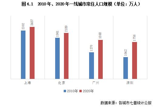 值得關注的是,頭部城市對人口的聚集度正在加速提升。這些城市均是區域發展中心城市,除北上廣深等傳統一線城市外,杭州、成都、重慶、武漢、南京和寧波等新興一線城市也因活躍的經濟發展下吸引了大量的流動人口。對比六普和七普數據來看,TOP10城市的常住人口占比由2010年的10.7%上漲至2020年的12.7%,提升了2.7個百分點,明顯高于TOP10之后的城市。