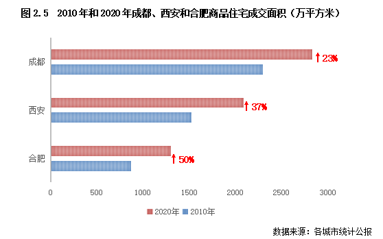 二線城市中,成都、重慶、合肥等中西部城市在“強省會”戰略支持下經濟發展邁入快速通道,城市吸引力也顯著提升,流動人口規模較十年前均顯著增加,如成都、合肥和西安2020年的流動人口規模較十年前均增長了一倍以上,增量都在200萬以上。在此影響下,當地住宅成交規模也快速增長,至2020年這三個城市的商品住宅成交面積均超過了1000萬平方米,較十年前漲幅均在20%以上。
