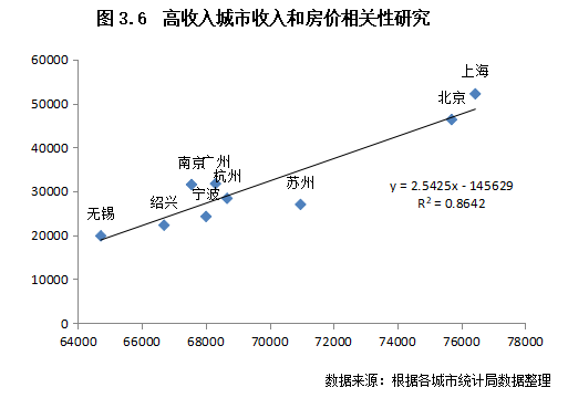 值得注意的是,高收入城市通常也是房價較高的城市,我們將TOP10城市收入和房價進行線性擬合,結果發現,排除深圳一個異常項之后,R2高達0.86,相關性高達0.93。這表明高收入群體對高房價有較強的支撐性,這也與印證了前文提到的收入水平較為突出的京、滬房價同樣遙遙領先。