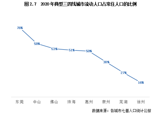 三四線城市方面,上文中提到的人口結構最為年輕的大灣區城市,如東莞、佛山等,流動人口規模也顯著高于其他三四線城市。同時,這些城市的流動人口占常住人口的比重均超五成以上,尤其是東莞,流動人口占比已高達76%。因此,這些城市中外來人口的購房需求已成為當地購房主力。