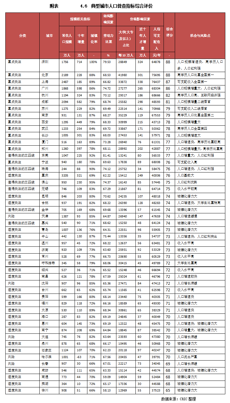 為了對TOP50城市房地產市場前景有一個相對客觀、綜合的評價,基于上文的研究,我們從規模、結構和房價三個維度選取了常住人口規模、近十年人口增量、城鎮化率、勞動力比重、高學歷人口比重、高學歷人口增量和收入水平等七個指標,并賦予各影響因子適當的權重,從人口角度構建了一個相對客觀的綜合評價體系,將50個樣本城市分為重點關注的城市、適度關注城市、風險城市以及表現突出的三四線城市。(詳見文末附表)