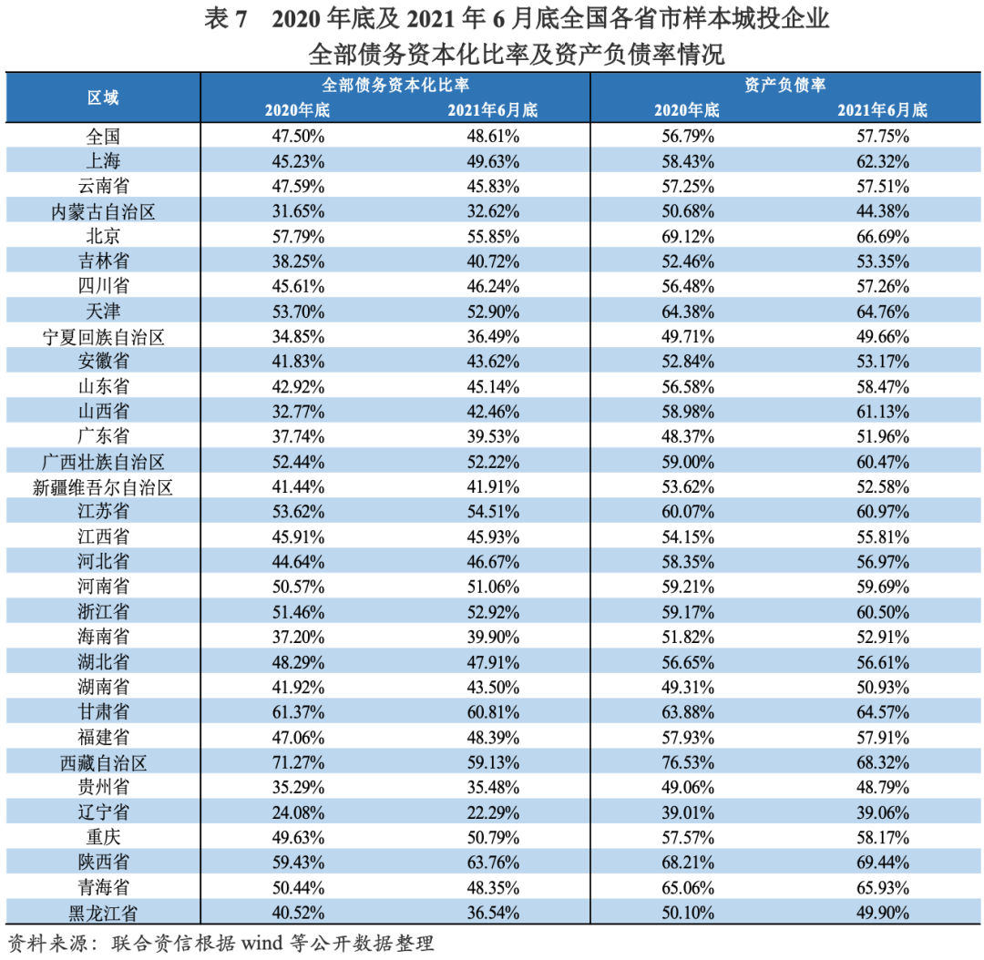 在資產負債率、全部債務資本化比率方面,樣本城投企業2015-2020年及2021年6月底的變化趨勢基本一致。2015-2017年,樣本城投企業資產負債率、全部債務資本化比率的增長幅度相對較大,杠杠水平上升較快;2018年底,樣本城投企業資產負債率、全部債務資本化比率的增幅較2017年底明顯下降,企業杠桿水平增長放緩。2019-2020年及2021年6月底,上述指標增幅略有回升,幅度均在2.0%以內。2021年6月底,樣本城投企業資產負債率、全部債務資本化比率分別為57.75%和48.61%。