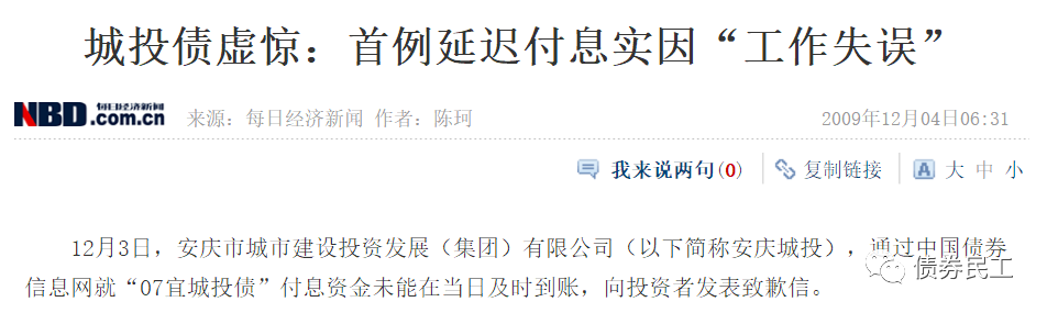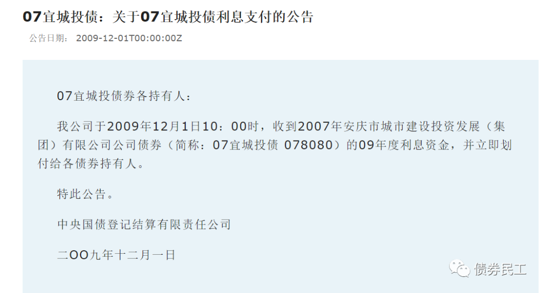 安慶市城市建設(shè)投資發(fā)展(集團)有限公司于2007年11月30日發(fā)行了“2007年安慶市城市建設(shè)投資發(fā)展(集團)有限公司公司債券”(以下簡稱“07宜城投債”),付息日為每年的11月30日。“07宜城投債”本應(yīng)該于2009年11月30日本期債券2009年度的支付債券利息,但是實際上支付時間為2009年12月1日,延遲了一天。安慶城投發(fā)布致歉信,明確利息延遲支付的原因是工作失誤。