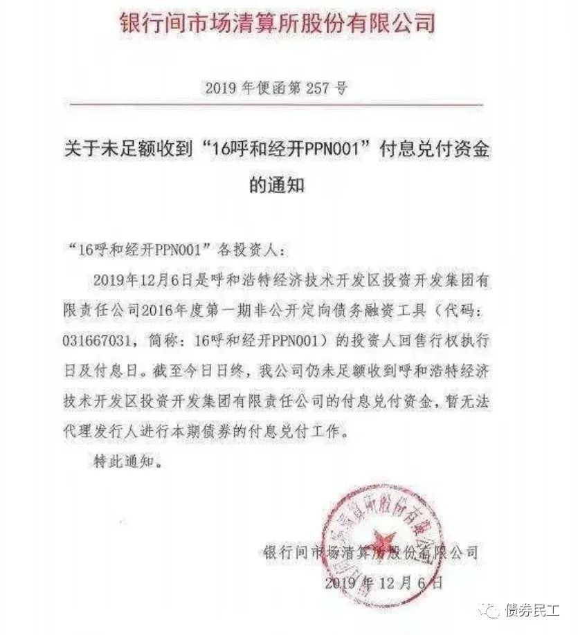 呼和浩特經(jīng)濟技術(shù)開發(fā)區(qū)投資開發(fā)集團有限責(zé)任公司于2016年9月26日發(fā)行了“ 呼和浩特經(jīng)濟技術(shù)開發(fā)區(qū)投資開發(fā)集團有限責(zé)任公司2016年第一期非公開定向債務(wù)融資工具”(以下簡稱“16呼和經(jīng)開PPN001”),到期日為2019年12月6日。2019年12月6日,上清所發(fā)布公告,明確未足額收到“16呼和經(jīng)開PPN001”付息兌付資金。