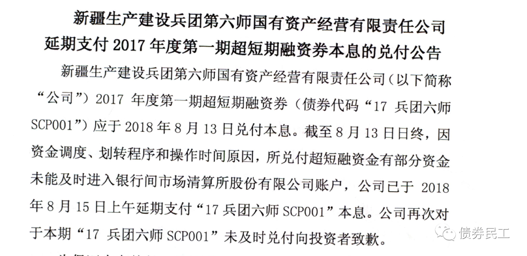 2018年8月15日上午,新疆生產(chǎn)建設(shè)兵團第六師國有資產(chǎn)經(jīng)營有限責(zé)任公司發(fā)布公告,已經(jīng)將“17兵團六師SCP001”的債券本息足額支付到上清所。