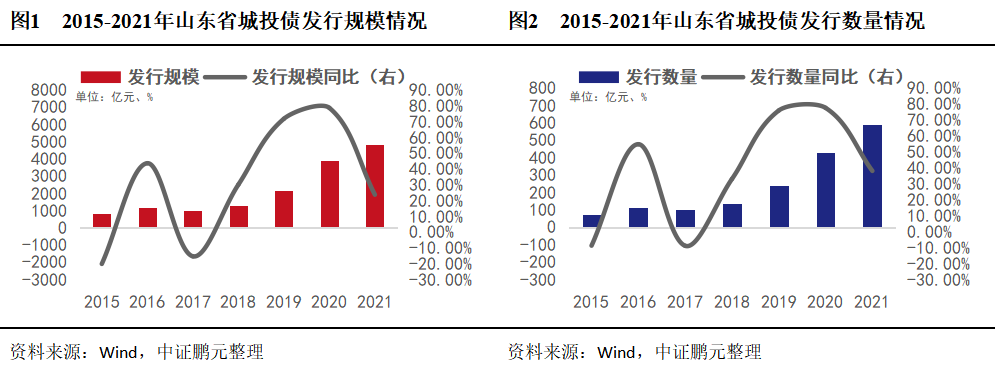 山東省作為北方沿海省份,地理條件優越,地區生產總值、一般公共預算收入及政府性基金收入等在全國均處于前列,整體經濟實力雄厚。山東省城投公司數量較多,是全國的城投債發債大省,2021年山東省城投公司發債規模在全國范圍內依舊保持前列,僅次于江蘇省及浙江省。2018年以來山東省城投公司發債規模快速增長,2019-2020年城投債發行規模及數量均同比實現了70%以上的增速,但在信用環境沖擊、城投債監管政策持續加強等背景下,2021年增速放緩較為明顯,全年全省共發行城投債591支,發行規模4,855.29億元,發行規模和數量同比增速分別下降至23.75%和38.08%。