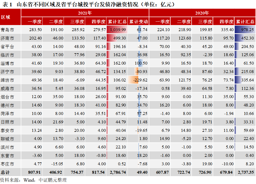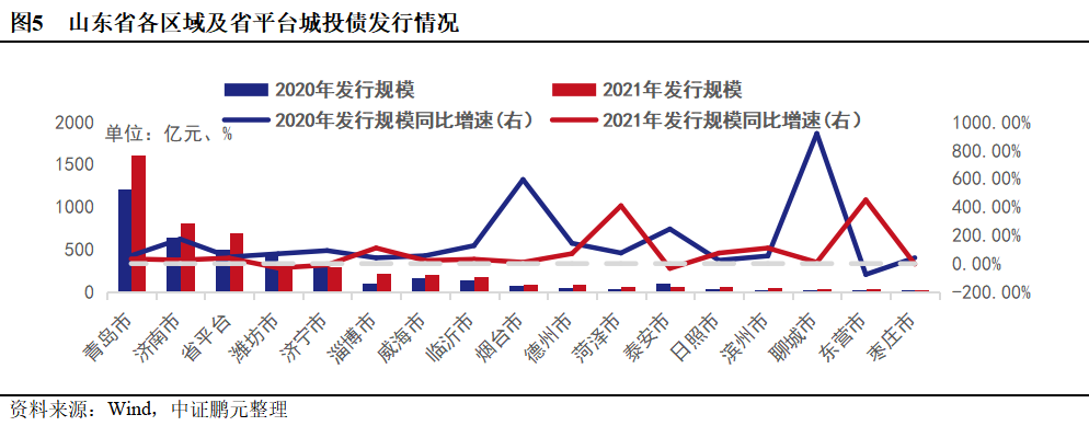 (1)山東省2021年城投債發債總量保持增長,區域分化明顯。2021年山東城投發債規模和凈融資額均較2020年有所增加但增速放緩,同時季度波動明顯。青島、濟南等實力較強區域發行仍然活躍,“網紅”區域有所收縮。