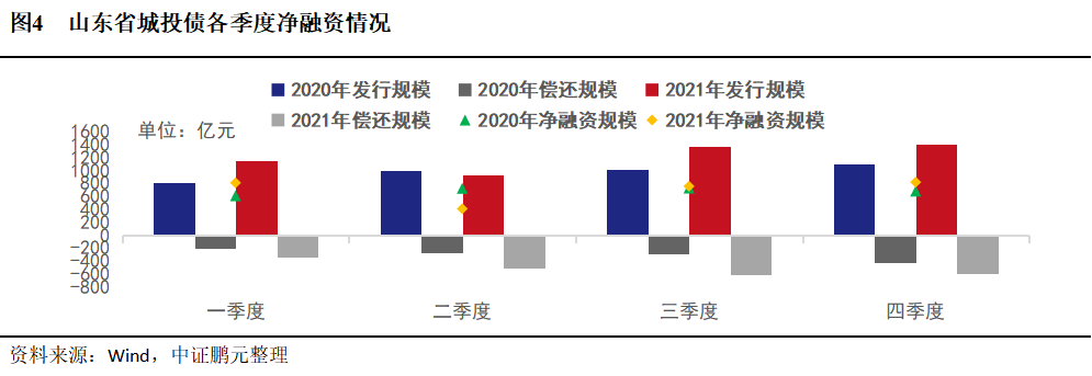 2021年山東城投發債規模和凈融資額均較2020年有所增加但增速放緩,同時季度波動明顯