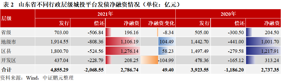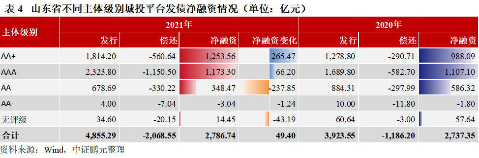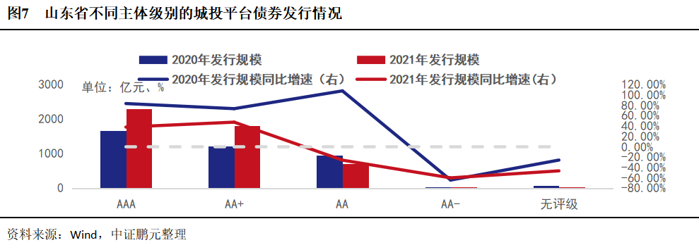 (2)高行政層級、高評級主體發行規模占比增加,弱資質平臺增速下降明顯。2021年山東省高行政層級主體城投債發行規模占比增加且同比增速相對更高、增速放緩程度也更小,區縣主體發行增速大幅下滑。高級別主體城投債發行規模占比提升,同比增速表現更為穩健,同時也是拉動凈融資增長的主要動力。