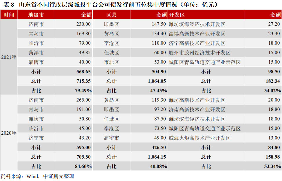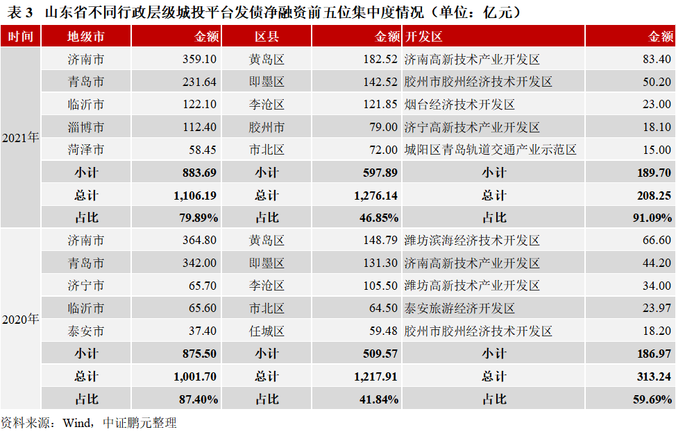 此外,從不同層級的凈融資集中度來看,與2020年相比,2021年區縣和開發區級別的城投主體前五位合計占比有所提升,地市級城投主體的凈融資前五位合計占比有所下降,集中度分化較大。
