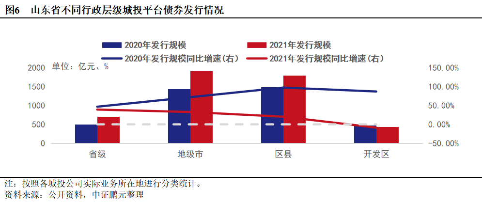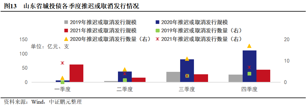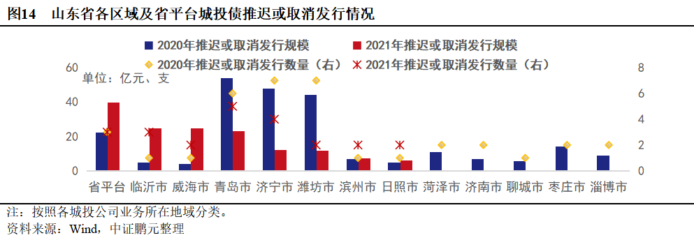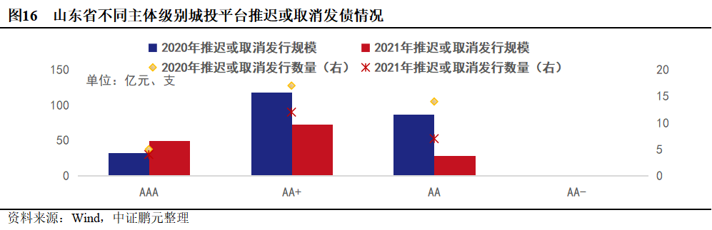 從不同行政層級主體來看,2021年山東省地級市和省級主體推遲或取消發行的城投債規模更大,但從數量上看區縣和地級市城投更多。