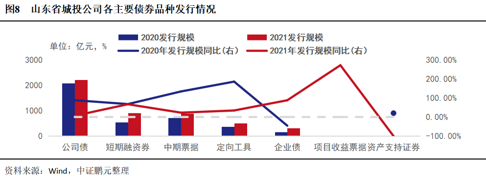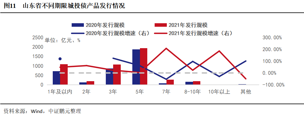 從城投公司發行的主要債券品種來看,公司債仍為2021年山東省城投公司發債品種的主力,但受政策收緊的影響,城投公司發行公司債的規模占全部發債品種的45.66%,同比下降7.39%,發行規模增速下滑至6.50%。此外,2021年山東省城投公司發行中期票據及定向工具規模的同比增速同樣出現不同程度的下滑,市場信用環境沖擊及融資環境收緊對上述債券品種的發行均有不同程度的影響,但期限較短的短期融資券并未受到顯著影響。另外值得關注的是,2021年山東省城投公司發行企業債的規模增速逆勢回升,同比增長了87.66%,企業債成為山東省越來越多的城投公司及市場投資者的選擇。