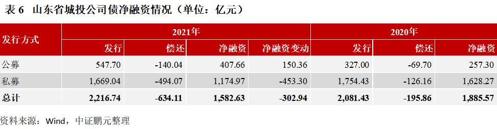 2021年山東省城投公司債公募債和私募債的發行規模分別為547.70億元和1,669.04億元,分別較2020年增加220.70億元和減少85.39億元。公募債和私募債分別實現凈融資407.66億元和1,174.97億元,較上年分別增加150.36億元和減少453.30億元。