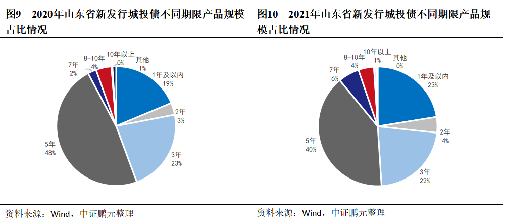 (3)公司債凈融資出現收縮,企業債表現亮眼,1年期及7年期產品占比有所提升。2021年山東省公司債、中期票據及定向工具等多個債券品種增速大幅放緩,公司債凈融資出現收縮,企業債表現亮眼但整體規模相對仍較小,同時1年期及7年期產品占比有所提升,5年期產品占比有所下降。
