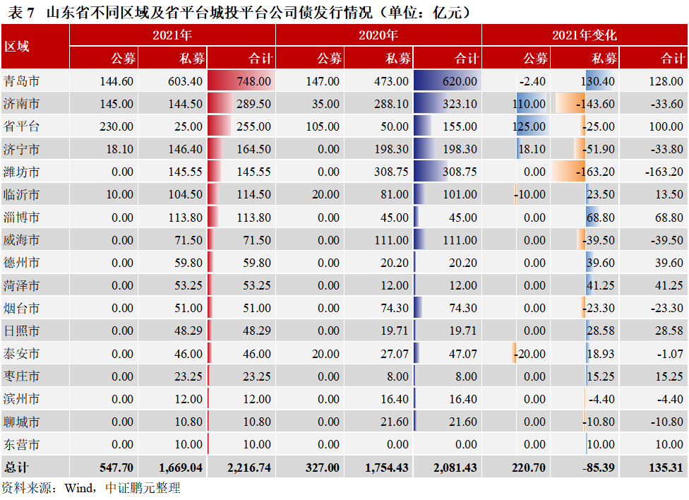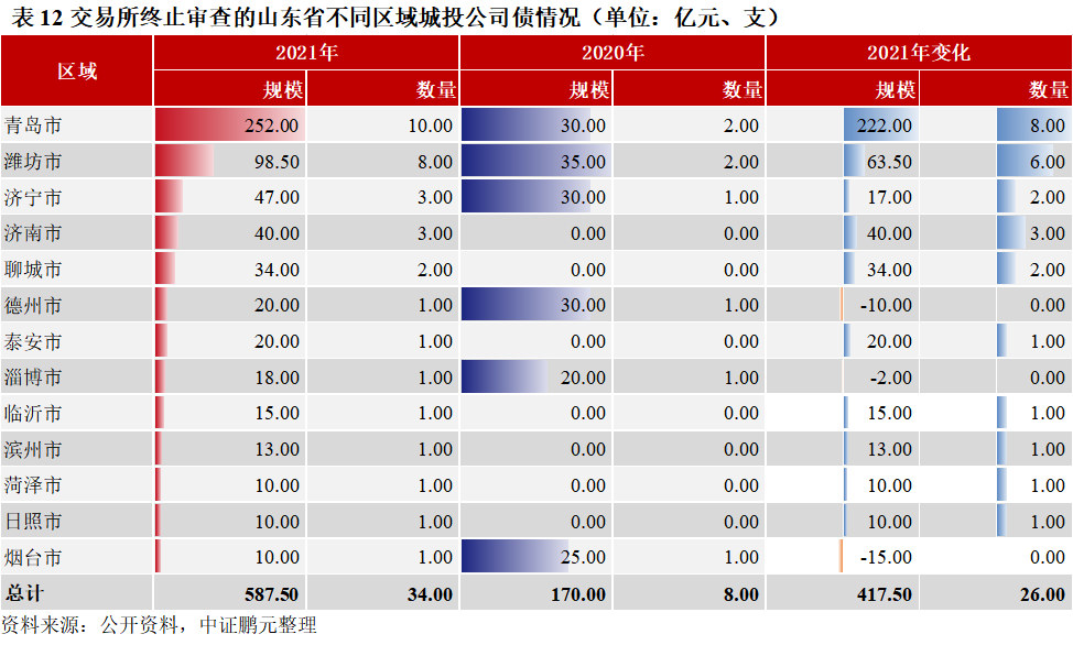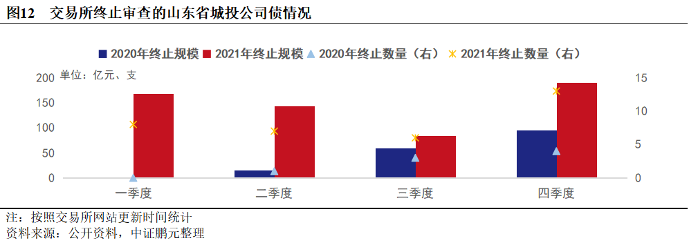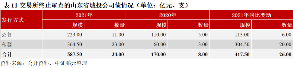 (5)交易所終止審查項目大幅增加,地區整體債務水平偏高區域推遲或取消發行債券更多。2021年山東省在交易所終止的公司債項目大幅增加,私募債受影響更大,青島和濰坊數量居前。推遲或取消發行的城投債數量和規模較上年均有下降,地區整體債務水平偏高區域多發。