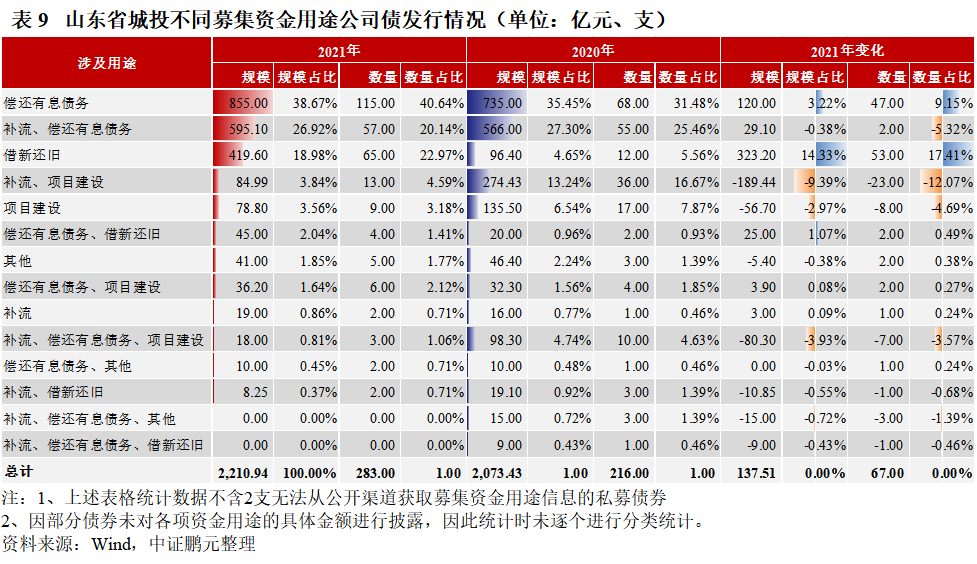 (4)交易所公司債發行分化,借新還舊占比提升。2021年山東省城投在交易所的公司債發行分化,公募債發行規模及凈融資仍增長,私募債發行規模及凈融資出現下降。交易所公司債募集資金全部用于借新還舊的城投債占比提升,用于項目建設的占比下降。