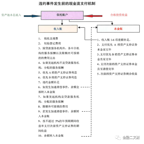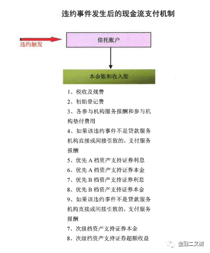 上圖所示產(chǎn)品有A、B檔兩個(gè)層級(jí)及次級(jí),當(dāng)出現(xiàn)違約事件后,償付順序是優(yōu)先A檔本金、利息 優(yōu)先B檔本金、利息 次級(jí)本金及超額收益。當(dāng)優(yōu)先A檔本息正常兌付時(shí),而B檔本息無(wú)法正常兌付時(shí),優(yōu)先B檔發(fā)生實(shí)質(zhì)違約,而當(dāng)次級(jí)本金損失,而優(yōu)先A、B檔正常兌付本息時(shí),小編認(rèn)為沒(méi)有發(fā)生實(shí)質(zhì)違約,風(fēng)險(xiǎn)事件會(huì)影響現(xiàn)金流分配但不一定導(dǎo)致違約。