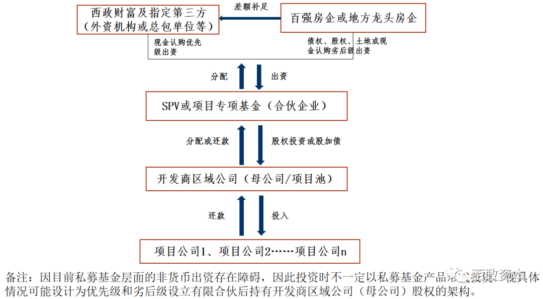 以上述融資架構為例,因總包單位的前融配資一般不涉及到開發商自有資金的配比和出資的問題,因此我們在做融資架構時對于開發商出資的部分一般都會以比較靈活的方式進行處理。在上述架構中,我們安排總包施工單位以現金認購優先級出資,開發商以債權、股權、土地等認購劣后級出資,優先與劣后級出資完成后總包資金注入SPV(或合伙企業),SPV(或合伙企業)以“股+債”方式將資金繼續注入開發商區域公司(母公司),區域公司隨后將資金注入參與土地競拍或有在建項目的各個項目公司,資金最終用于繳納土地款或項目的開發建設。