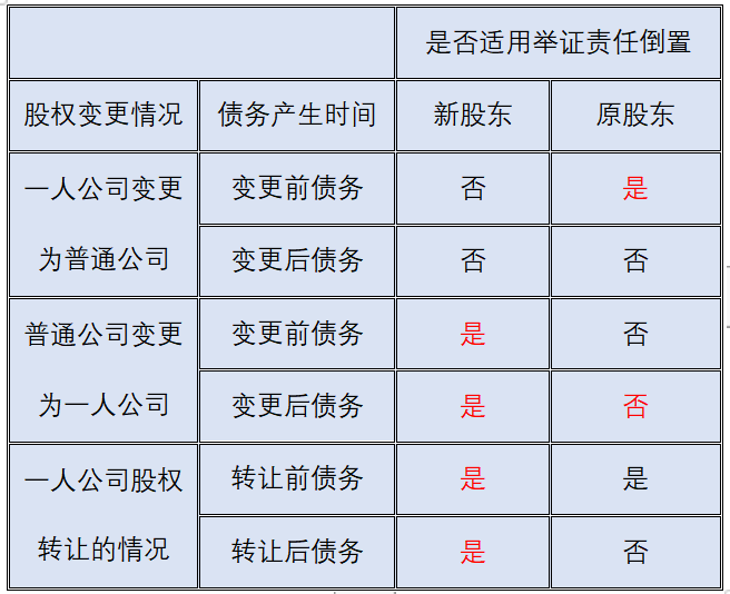 另外,對于變更為普通公司后新加入的股東,以及變更為普通公司后新產(chǎn)生的債務(wù)。一方面,因為新股東加入時,其利用一人公司的特殊治理結(jié)構(gòu)隨意支配公司財產(chǎn)的客觀條件已不存在;另一方面,也不存在債權(quán)人會基于公司之前的登記公示信息而對公司當下的償債能力產(chǎn)生合理預(yù)期的可能。因此,對于新加入的股東以及變更為普通公司后新產(chǎn)生的債務(wù),股東無需因舉證責任倒置而承擔連帶清償責任。