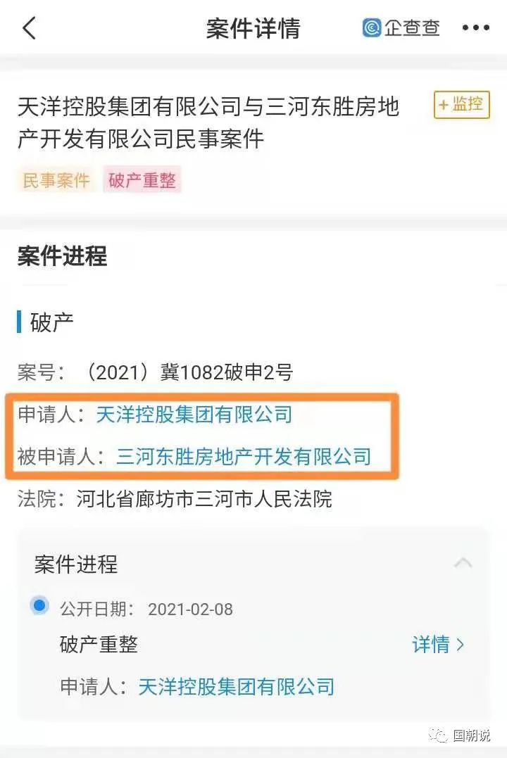 值得注意的是,申請人天洋控股集團有限公司是項目公司三河東勝的間接控股股東,通常情況下只有債務人才能申請破產。