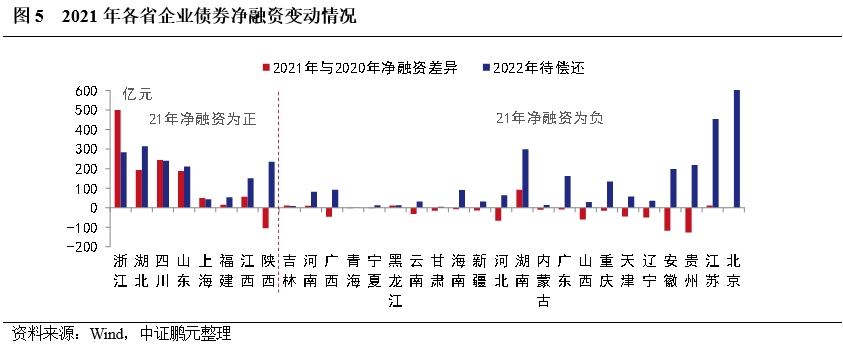 從地區(qū)分布看,2021年企業(yè)債凈融資依然呈現(xiàn)兩極分化,其中,8個省份凈融資為正,另有8個省份本年度尚未發(fā)行企業(yè)債。具體來看,浙江實現(xiàn)凈融資398.01億元,遠(yuǎn)高于其他省份,其次是湖北和四川分別實現(xiàn)凈融資281.57億元和273.51億元,位居第二、第三。此外,上海因償還規(guī)模較小,實現(xiàn)凈融資規(guī)模99.87億元,位居第四。而江蘇因償還規(guī)模較大,凈融資規(guī)模為-184.87億元。青海、甘肅、黑龍江、海南、內(nèi)蒙古、山西、遼寧和西藏本年未發(fā)行企業(yè)債,其中遼寧省累計償還109.51億元,償還規(guī)模較大。與2020年相比,12個省份凈融資規(guī)模出現(xiàn)增長,18個省份出現(xiàn)下降,其中,浙江和四川凈融資規(guī)模明顯增長,貴州、安徽和陜西的凈融資較上年出現(xiàn)明顯下降。北京、江蘇、湖南、湖北等省份,2022年待償還企業(yè)債規(guī)模較大,需關(guān)注償還壓力較大,且2021年凈融資出現(xiàn)下滑的地區(qū)。