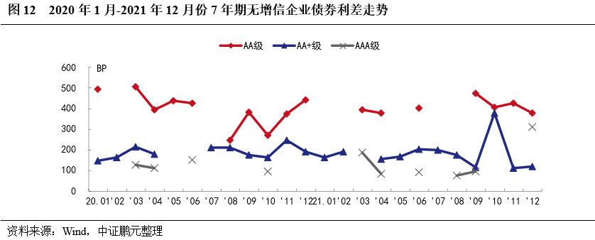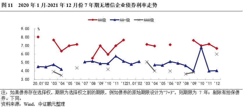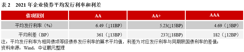 2021年,企業(yè)債券最高發(fā)行利率為8.00%,與上年下降50BP;最低發(fā)行利率為3.05%,較上年上行66BP。分債券級別來看,與上年相比,各級別企業(yè)債平均發(fā)行利均下行,平均發(fā)行利差均收窄,其中AA和AA+級較AAA級降幅較大。