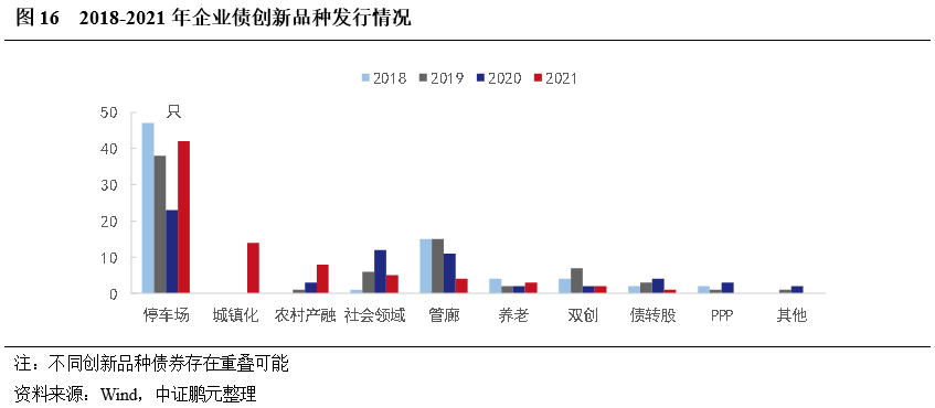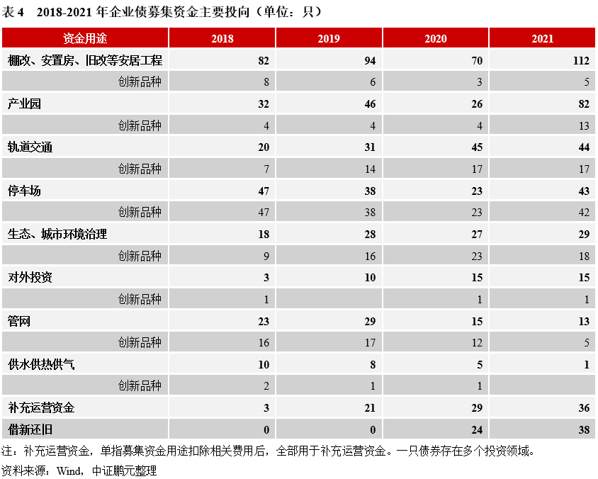從募集資金用途看,棚改、安置房等安居工程是企業(yè)債的主要投向,占比23%左右,其次是產(chǎn)業(yè)園相關(guān)項目2021年出現(xiàn)明顯增加,數(shù)量占比17%,軌道交通和停車場項目占比也相對較高,各占9%。此外,2020年來,借新還舊和全額補(bǔ)充運營資金(扣除相關(guān)發(fā)行費用后)明顯增加。結(jié)合創(chuàng)新品種看,除停車場長期以發(fā)行專項債為主外,生態(tài)、城市環(huán)境治理領(lǐng)域發(fā)行創(chuàng)新品種的占比也較高,主要為綠色債,軌道交通和管網(wǎng)領(lǐng)域創(chuàng)新品種也較多,其他領(lǐng)域中創(chuàng)新品種較少。