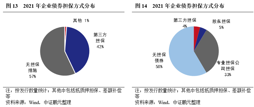 2021年,企業(yè)債有擔(dān)保的債券共計231只,數(shù)量占比43%,與上年基本持平。分主體級別看,AA級主體選擇增信發(fā)行的債券比重為82.6%,較上年上升6.1個百分點;AA+級主體選擇增信發(fā)行的債券比重為9.1%,較上年下降2.7個百分點。有擔(dān)保債券的擔(dān)保方以專業(yè)擔(dān)保公司為主,占比33%,較上年上升3個百分點。從趨勢看,2021年7月以來有增信債券占比相對平穩(wěn),11月來有所抬升。