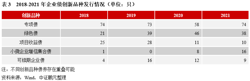 2021年企業(yè)債創(chuàng)新品種合計144只,較上年增加14只,占比29.3%,較上年下降4.3個百分點。第一,發(fā)改委專項債是企業(yè)債市場主要創(chuàng)新品種,在全市場占比約15%。其中,停車場建設(shè)專項債券37只,是專項債主要品種;縣城新型城鎮(zhèn)化建設(shè)專項債券14只,為新增的專項債創(chuàng)新品種;另外,農(nóng)村產(chǎn)業(yè)融合發(fā)展專項債券8只,較往年明顯增長,而地下綜合管廊建設(shè)專項債券本年發(fā)行4只,較往年出現(xiàn)明顯下降。第二,小微企業(yè)增信集合債受政策推動,2021年發(fā)行數(shù)量增長100%。主要由地級市城投公司發(fā)行,2018年來,共有12家地級市城投公司發(fā)行14只小微企業(yè)增信集合債,占比56%。第三,綠色債受政策推動,2018年來呈現(xiàn)增長,2021年數(shù)量有所減少。“碳達(dá)峰、碳中和”目標(biāo)的提出,進(jìn)一步推動了綠色金融的發(fā)展,2021年綠色債券發(fā)行規(guī)模3720.85億元,較上年增長115%。其中,綠色企業(yè)債發(fā)行38只,較上年下降17%。與其他債券品種的快速增長有關(guān)。