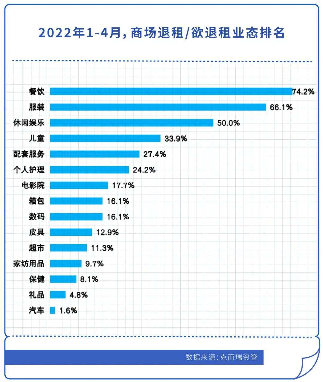 2022年1-4月疫情期間,克而瑞資管對商業運營影響以及之后6個月租金走勢進行了抽樣調研,1-4月北上廣深典型商場近8成出租率下降,其中3成出現大幅下降,退租業態中,餐飲、服裝和休閑娛樂位列前三,分別為74%、66.1%和50%,占比遠高于排名第四的兒童業態。