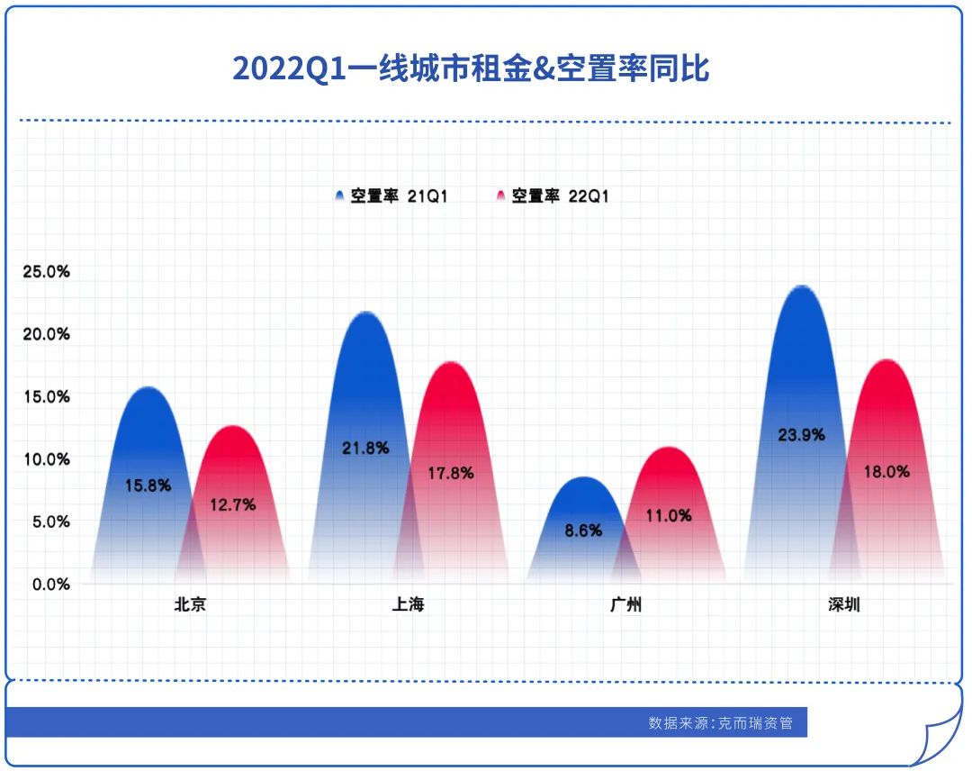 2022年一季度,北上廣深四個城市中,空置率均值在15%左右,略有下降,其中,深圳空置率最高為18%。
