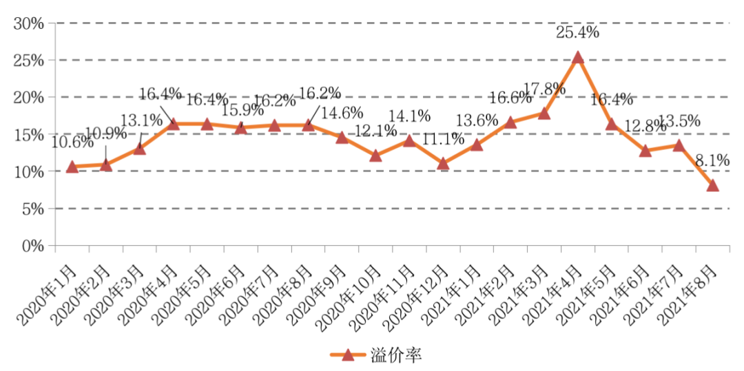 值得注意的是,由于熱點城市在8月紛紛迎來溢價、地價的管控,加之優質地塊成交占比明顯減少,地市場溢價率較上月大幅下滑,8月環比減少5.4個百分點,降至8.1%,創下2020年以來的最低值。