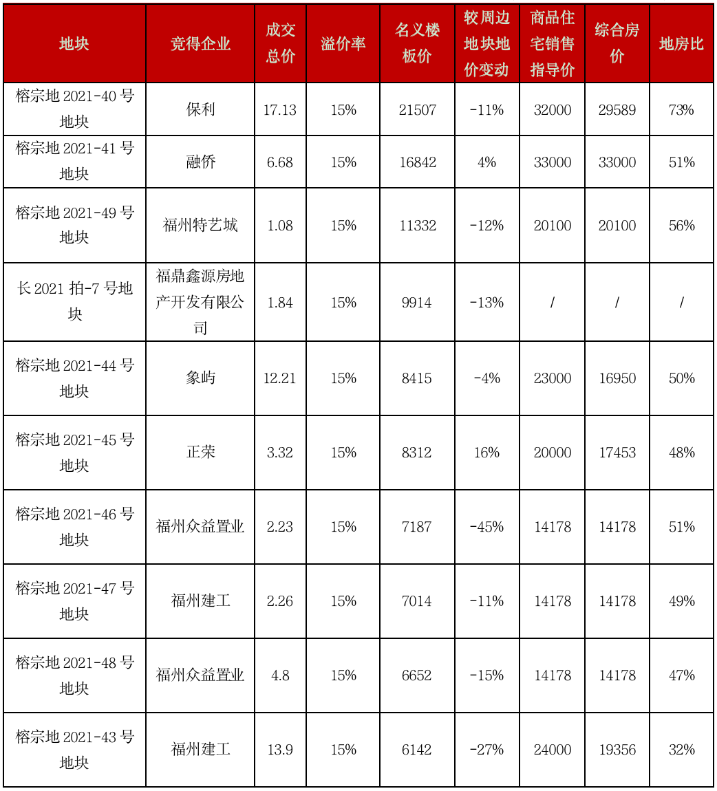 即便是熱門晉安區紅光村地塊,尚有一定盈利空間。該地塊共吸引10余家房企參拍,開拍即觸及最高限價進入搖號環節,最終保利以17.13億+搖號競得,平均樓板價高達21507元/平方米,也是本場土拍中樓板價最貴的地塊。該地塊還要配建2萬平方米人才限價商品房(價格為商品住宅備案價格的70%),按照商品住宅銷售指導價為32000元/平方米綜合測算,地房比為73%,房地差超8000元/平方米,也不算“無利可圖”。